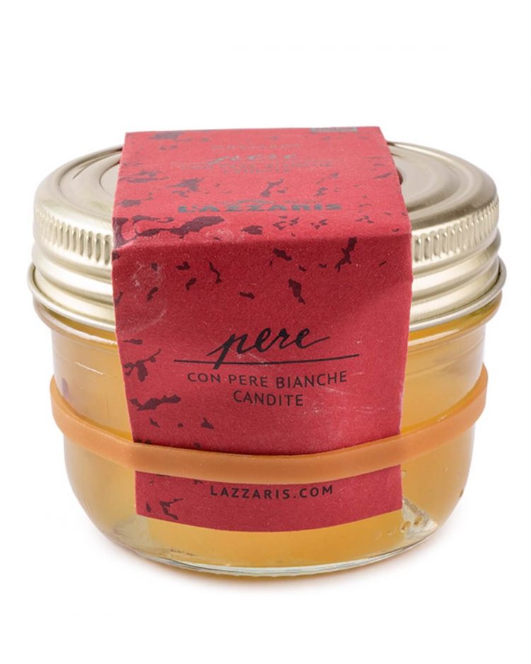 Candied pears 60% (pears, glucose-fructose syrup, sugar, acidifier: citric acid, antioxidant: sulphur dioxide), sugar, water, glucose syrup, mustard flavour, flavourings. Gluten free