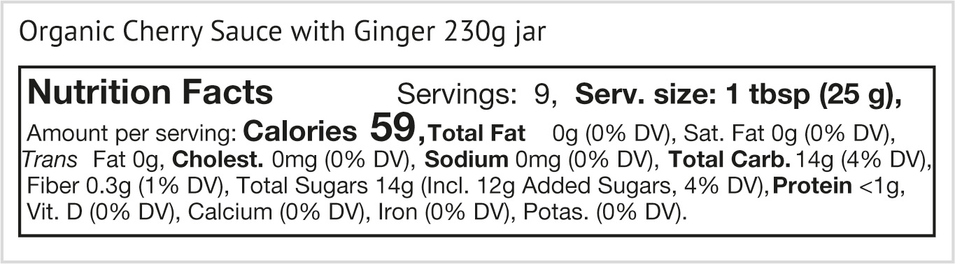 Cherries* 68%, cane sugar*, ginger* 0,9%, lemon juice*. * organic ingredients.