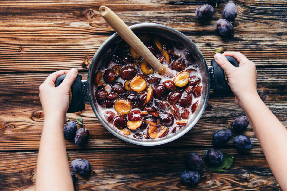 • After 30 minutes, turn the stove on to medium-low heat and bring the plum mixture to a boil. Once you reach 100°, lower the heat and let it simmer for about 45-60 minutes; the jam must have a thick and creamy consistency. Remember: it is important to stir occasionally to prevent the jam from sticking to the bottom of the pan.